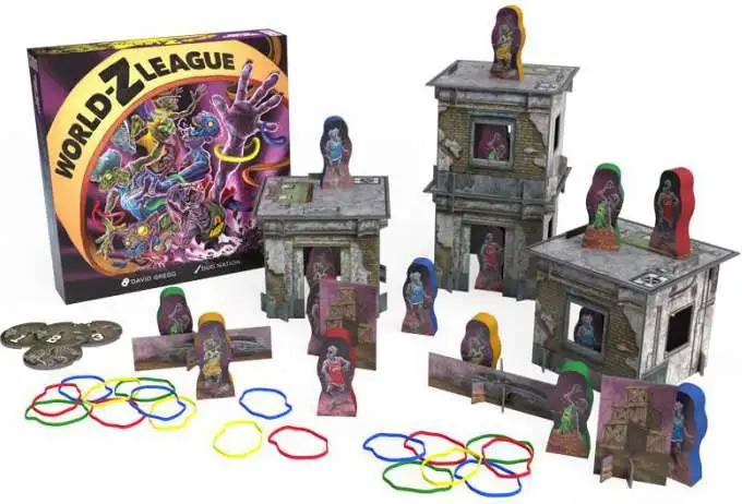 The apocalypse has come and gone with the zombies here to stay along with their counter agent: the ZSA. Now dear competitors the Zombie Shooting Association welcomes you to the Z-World League! Choose your team, hide among the rubble and unleash rubber band fueled fury to knock over opposing zombies. Secure the highest earnings and be titled: CHAMPION!