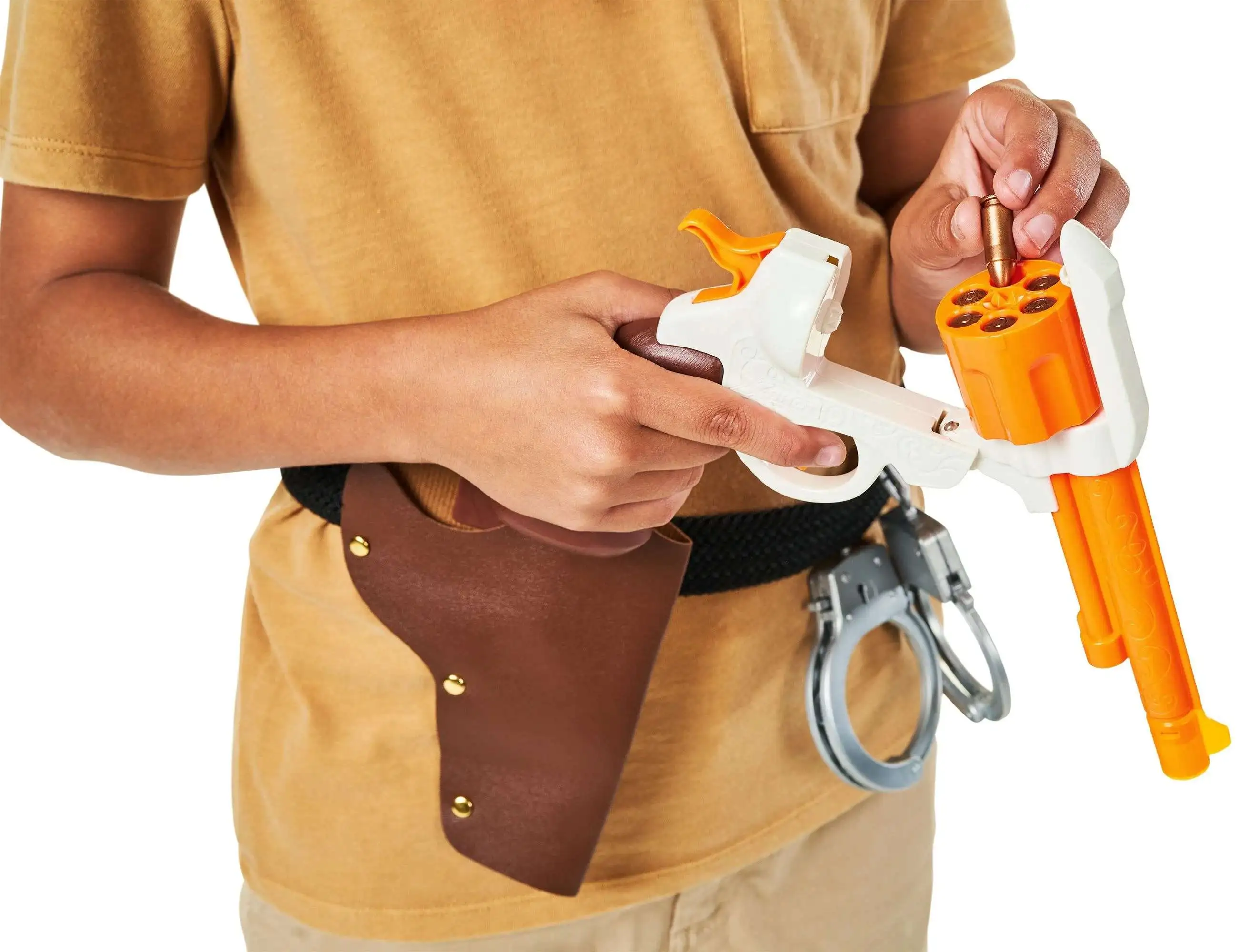 - Complete Wild West role-play set with a light-up blaster, handcuffs, holster, and six rounds for realistic duels.