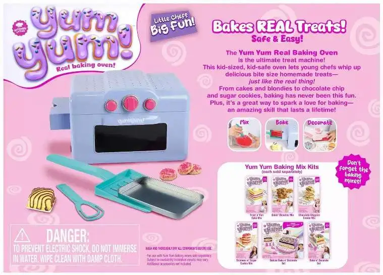 - Bake up big fun in a kid-sized oven! The kid-friendly YumYum! Real Baking Oven lets young chefs whip up sweet treats, with a little mix and a whole lot of imagination.
