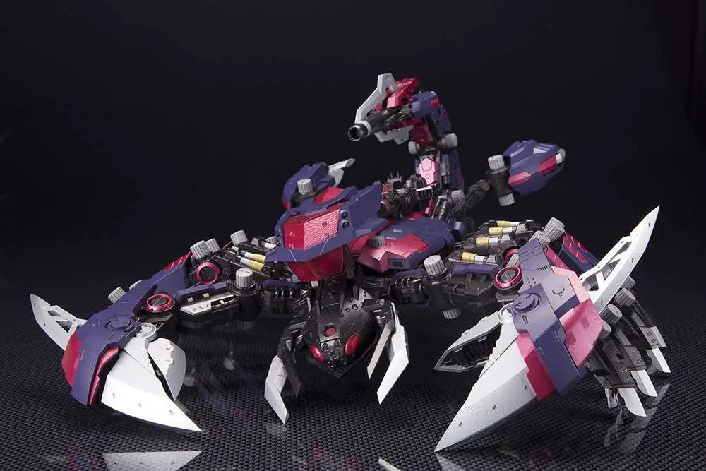 The Charged Particle Cannon is equipped on the end of the model's long tail. The AZ 120mm Hyper Laser Gun and AZ 120mm Hyper Beam Gun can be deployed, allowing the central barrel to be extended and displayed in action. The covers on the sides of the tail can be opened to convert the model to Sea Scorpion mode. The Strike Laser Bite Scissors and Laser Cutters on the front legs are moveable just like in the Zoids universe. The Strike Laser Bite Scissors can be opened and closed to reveal the AZ 105mm Linear Cannon stowed inside. The armor on the head can be opened, revealing the model's ommateum eyes recreated with clear parts. The cockpit can be opened to board a pilot figure inside. The E-Shield Generator on the head armor can be extended. The inner and outer Laser Fangs in the model's mouth can be moved independently. The powerful chest armor can be taken off to reveal the Zoid Core. The base of the AZ 930mm Double-Barreled Shock Gun can be posed to adjust the angle of the weapon. The Rocket Boosters on the back of the model are poseable. The model's four sets of legs are flexible and easy to pose. The claws on the ends can be adjusted for better stability.The Thruster Hatch under the chest can be extended, and the nozzle part can be displayed on a Flying Base Neo.