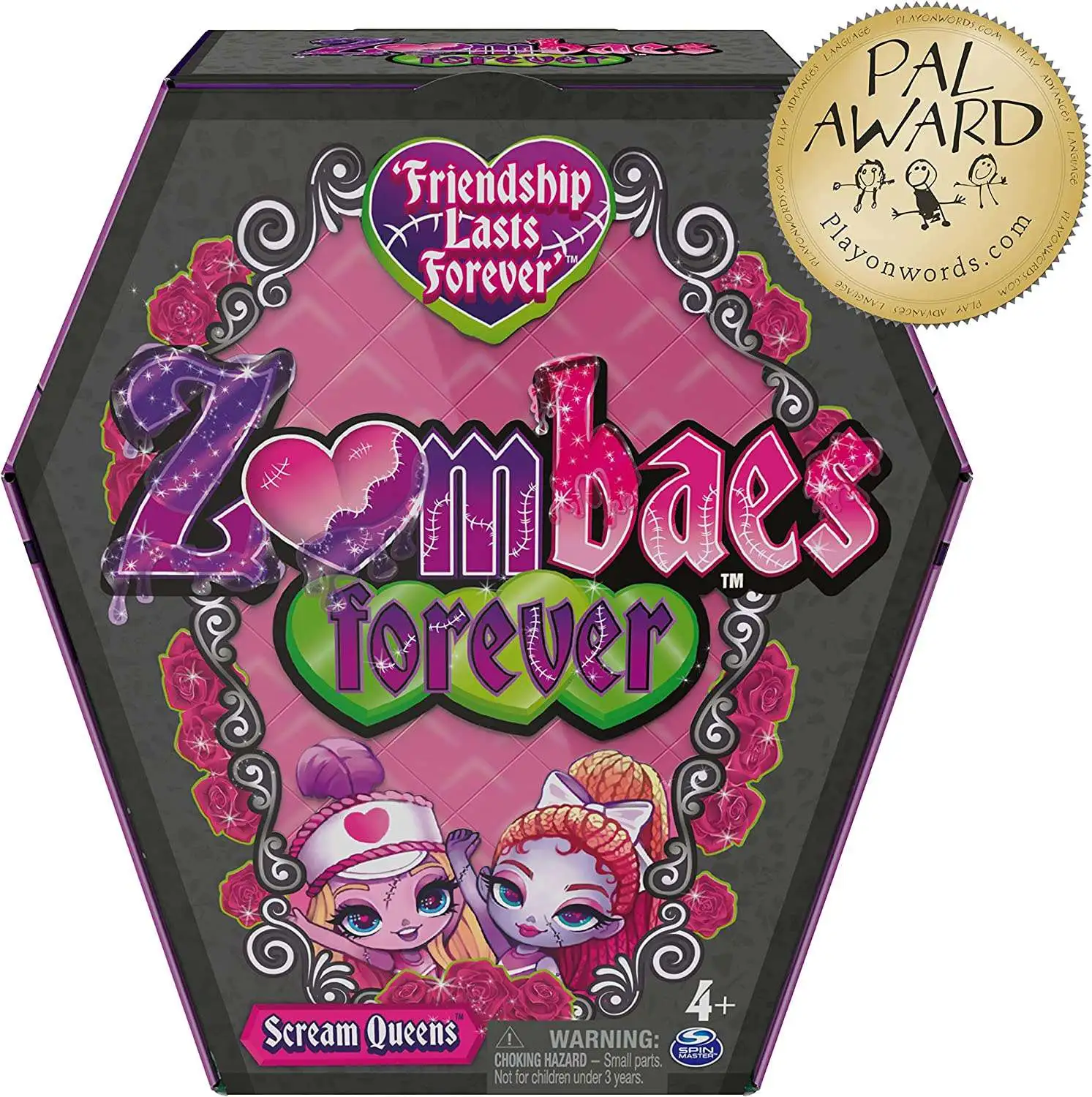 - Includes: 2 Zombaes Forever Dolls, 1 Accessory, 2 Doll Stands, 1 Zombaes Forever Pet, 1 Pet Coffin, 1 Trading Card, 1 Collector's Sheet