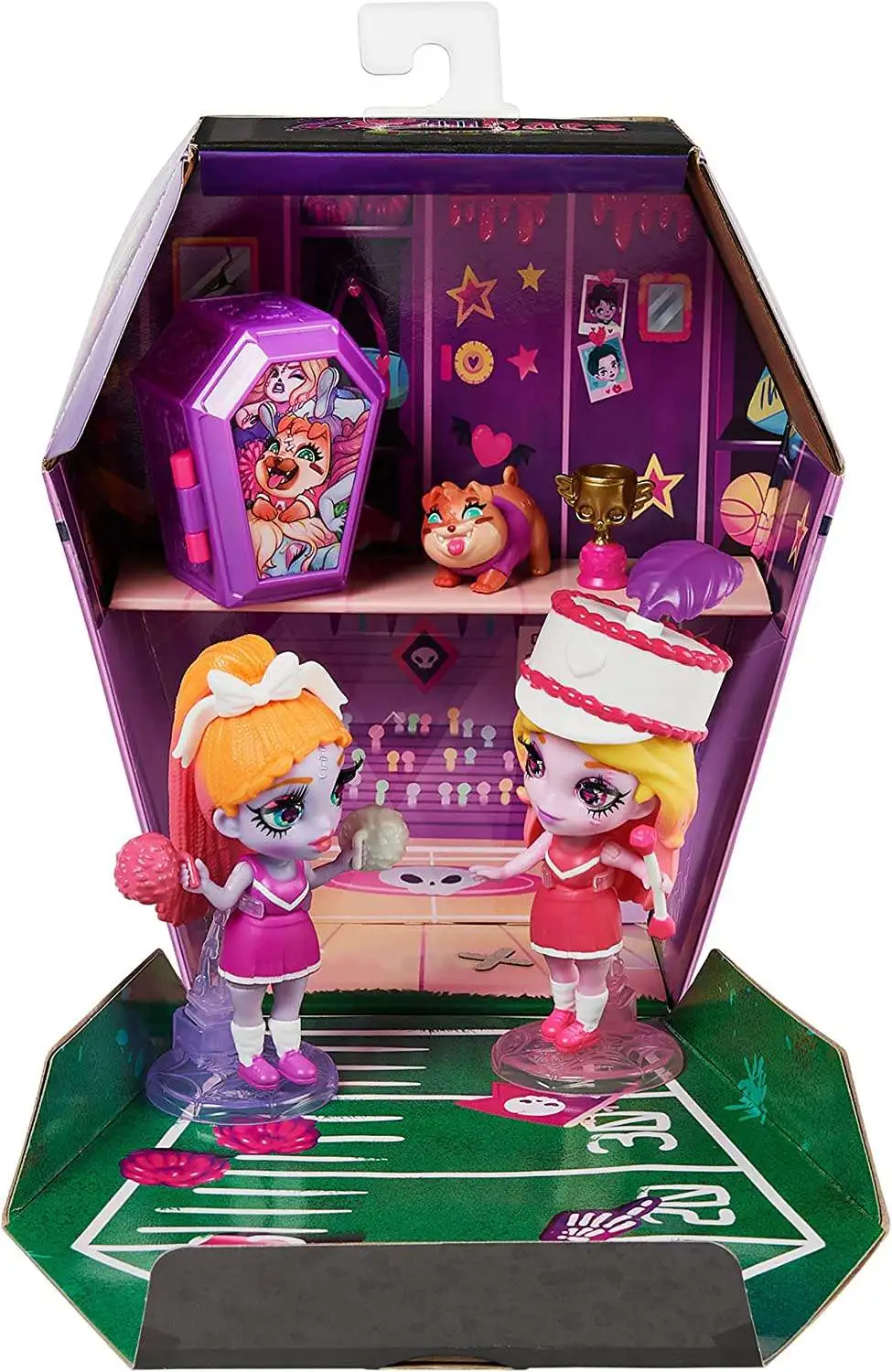 - 2 EXCLUSIVE COLLECTIBLE DOLLS: This themed set has 2 stylish Zombaes Forever girls toys, a trophy, coffin with a pet, 2 stands and a collector card! Each detailed 3.5-inch doll holds pom-poms and wears a cheer uniform!