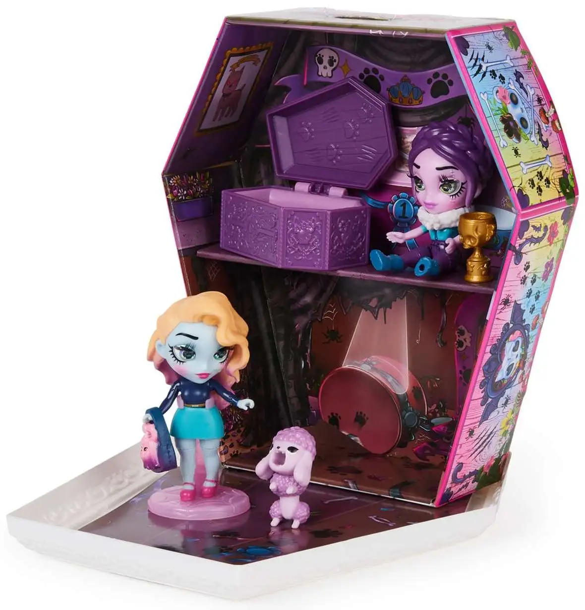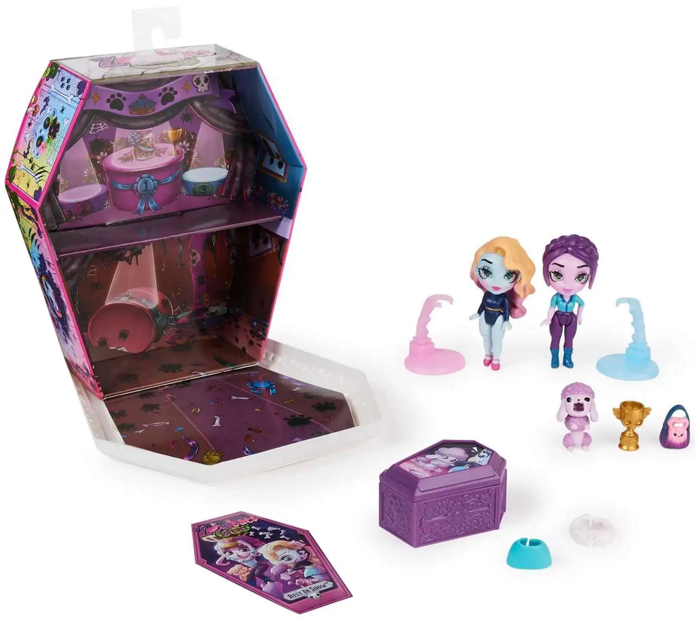 - SURPRISE PET UN-COFFIN-ING: Open the coffin to find a pet to add to your small doll pretend play storytelling it latches onto your doll`s arms! Also includes a purse dog, doll collar and a trophy.